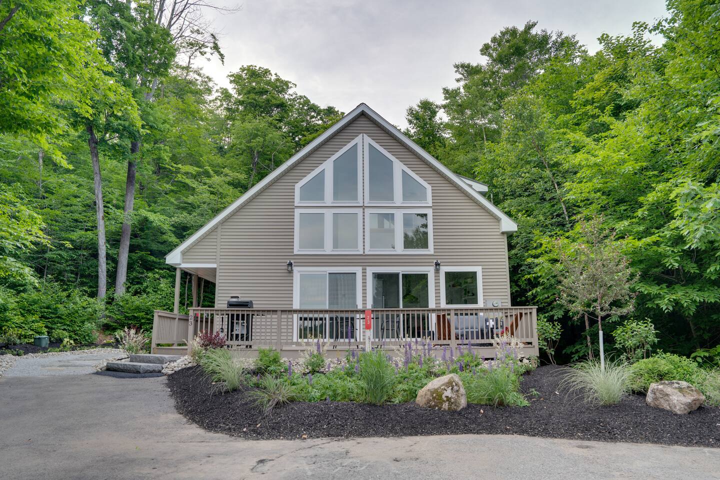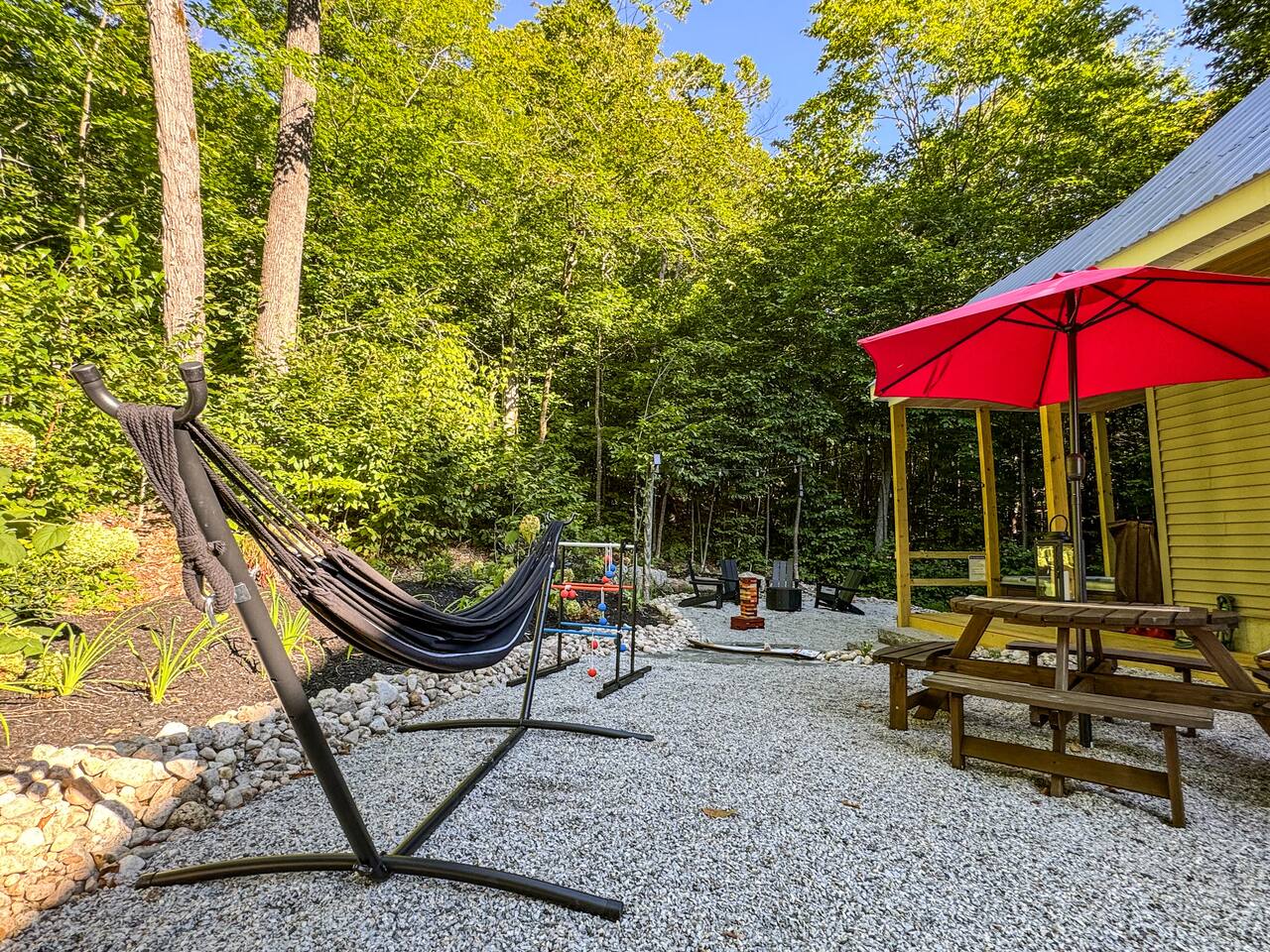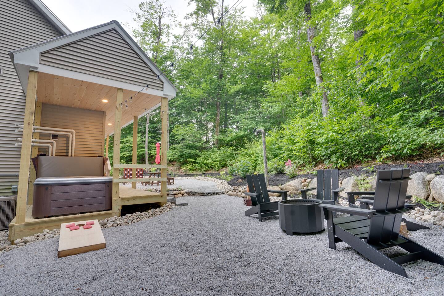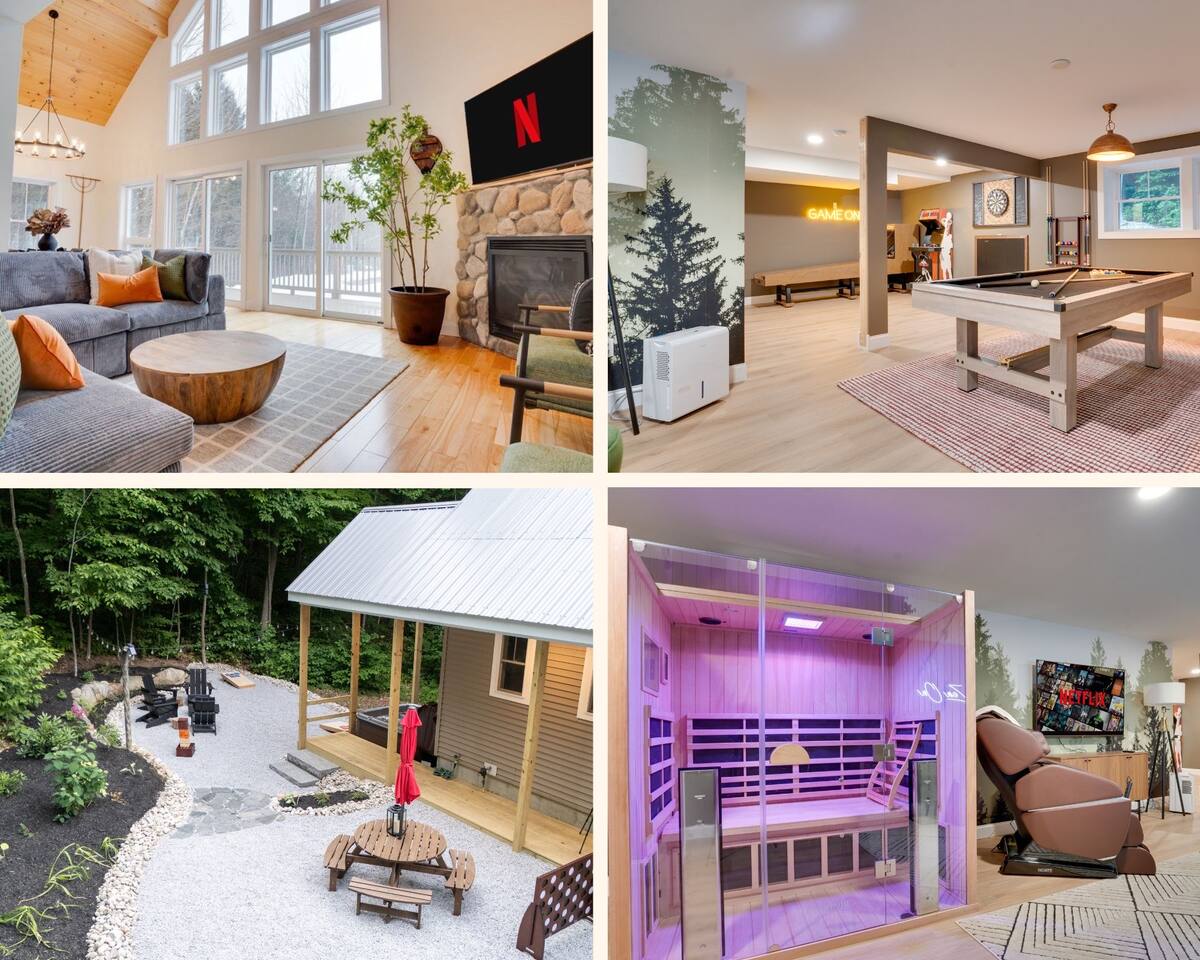 Escape to our stunning 2,200 sq/ft mountainside retreat in Bartlett, NH, perfect for an amazing vacation. Nestled on a private acre with seasonal mountain views, this spacious house comfortably accommodates up to 10 guests and offers both solitude and proximity to downtown Bartlett/Conway and top attractions! - BEDROOM 1 (Primary, Main Floor) - * Plush king-sized bed * 2024 Smart TV * Full body mirror * Full ensuite bathroom - BEDROOM 2 (2nd Floor) - * Plush king-sized bed * 2024 Smart TV * Full body mirror * Shared hallway bathroom - BEDROOM 3 (2nd Floor) - * Two twin-over-twin metal bunk beds (Built sturdy and can accommodate children or adults) * 2024 Smart TV * Full body mirror * Shared hallway bathroom - BEDROOM 4 (Basement) - * Full-size sofa bed * 65ā Smart TV * Full ensuite bathroom - GAMEROOM (Basement) - * Sauna * Massage chair * Pool table * Arcade games (NBA Jam, PacMan, Nintendo Classic) * Skee-ball * Dartboard - CHEFāS KITCHEN - * Electric range & plenty of cooking space * Fully-equipped * Large Fridge * High-End Stainless Appliances * Tons of Cabinetry * Countertop with Seating for 3 * Dining Room Table Seating for 8 * A Keurig & a filtered coffee maker - LIVING ROOM - * 65ā Smart TV * Lots of natural lighting * Cozy sectional couch * Kitchen and dining area with vaulted ceiling and direct access to the main deck - OUTDOOR FRONT DECK - * Lounge couch with many chairs * Grill * Mountain View - OUTDOOR SIDE DECK/BACKYARD - * Private Hot-Tub * Fire Pit w/Adirondack chairs * XL Jenga game * XL Connect 4 Game * Ladder Golf * Cornhole * Outdoor dining * String lights for added ambiance - ADDITIONAL INFO - * You can find the fire extinguisher in the kitchen. * Pack n Play / High Chair Included * In unit washer and dryer Experience an unforgettable vacation with a perfect blend of comfort, entertainment, and relaxation!