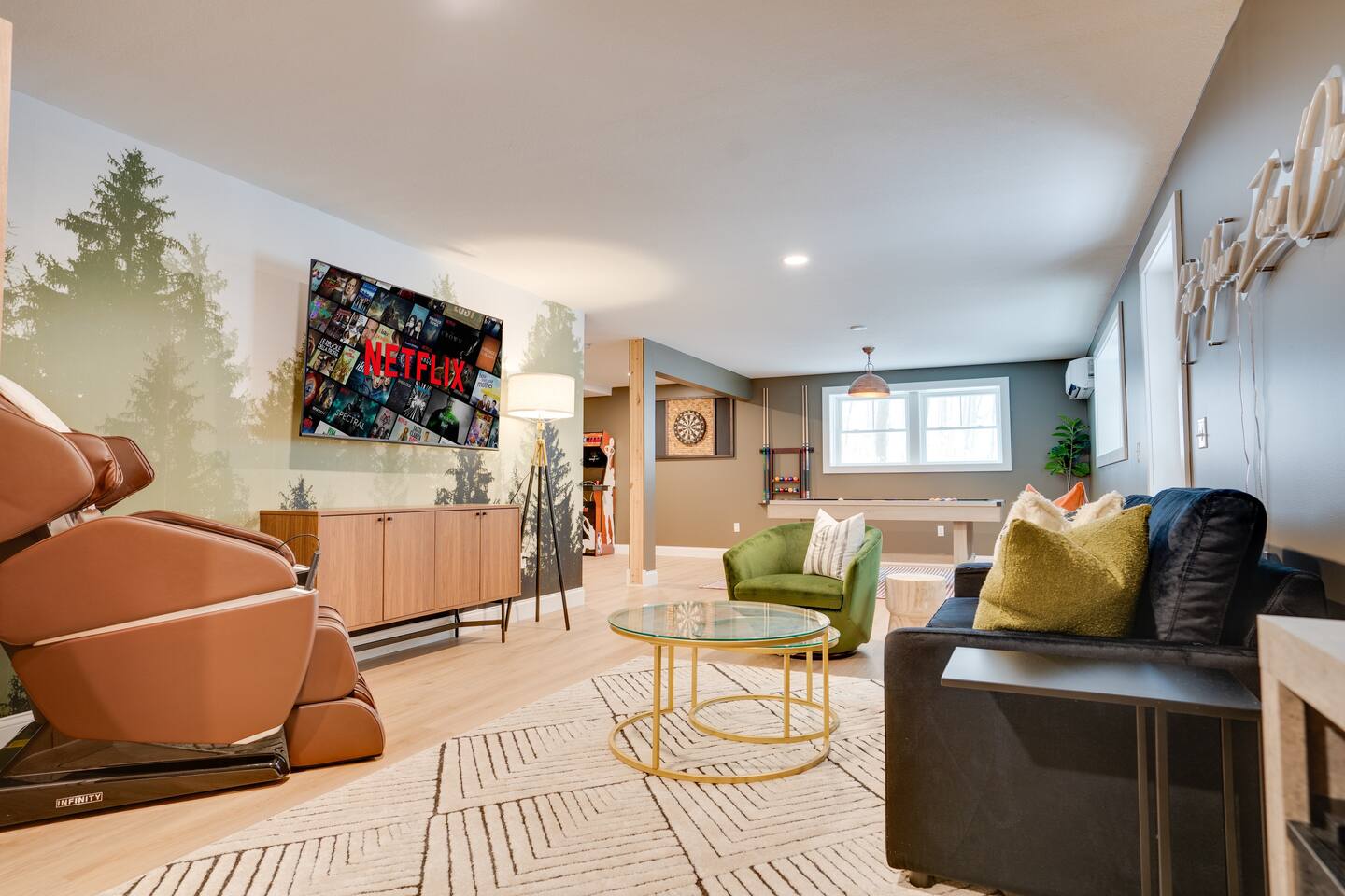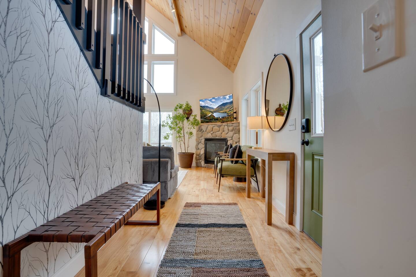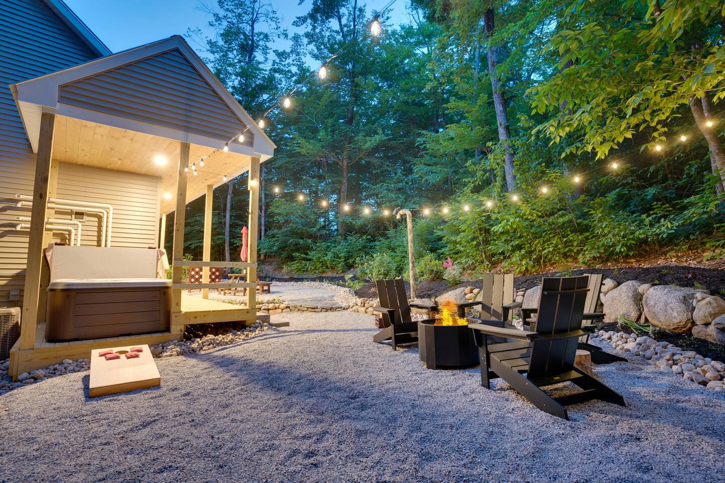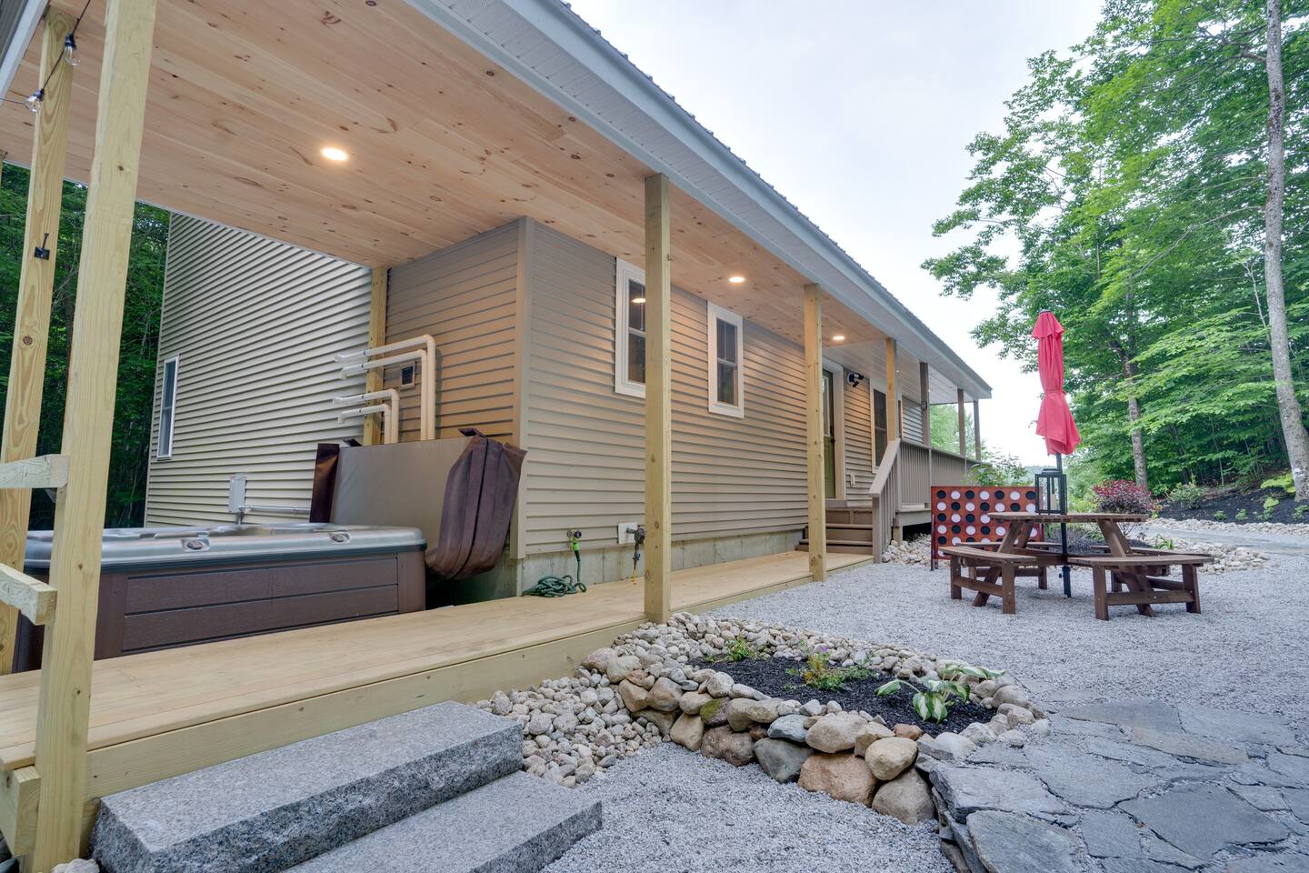 Escape to our stunning 2,200 sq/ft mountainside retreat in Bartlett, NH, perfect for an amazing vacation. Nestled on a private acre with seasonal mountain views, this spacious house comfortably accommodates up to 10 guests and offers both solitude and proximity to downtown Bartlett/Conway and top attractions! - BEDROOM 1 (Primary, Main Floor) - * Plush king-sized bed * 2024 Smart TV * Full body mirror * Full ensuite bathroom - BEDROOM 2 (2nd Floor) - * Plush king-sized bed * 2024 Smart TV * Full body mirror * Shared hallway bathroom - BEDROOM 3 (2nd Floor) - * Two twin-over-twin metal bunk beds (Built sturdy and can accommodate children or adults) * 2024 Smart TV * Full body mirror * Shared hallway bathroom - BEDROOM 4 (Basement) - * Full-size sofa bed * 65ā Smart TV * Full ensuite bathroom - GAMEROOM (Basement) - * Sauna * Massage chair * Pool table * Arcade games (NBA Jam, PacMan, Nintendo Classic) * Skee-ball * Dartboard - CHEFāS KITCHEN - * Electric range & plenty of cooking space * Fully-equipped * Large Fridge * High-End Stainless Appliances * Tons of Cabinetry * Countertop with Seating for 3 * Dining Room Table Seating for 8 * A Keurig & a filtered coffee maker - LIVING ROOM - * 65ā Smart TV * Lots of natural lighting * Cozy sectional couch * Kitchen and dining area with vaulted ceiling and direct access to the main deck - OUTDOOR FRONT DECK - * Lounge couch with many chairs * Grill * Mountain View - OUTDOOR SIDE DECK/BACKYARD - * Private Hot-Tub * Fire Pit w/Adirondack chairs * XL Jenga game * XL Connect 4 Game * Ladder Golf * Cornhole * Outdoor dining * String lights for added ambiance - ADDITIONAL INFO - * You can find the fire extinguisher in the kitchen. * Pack n Play / High Chair Included * In unit washer and dryer Experience an unforgettable vacation with a perfect blend of comfort, entertainment, and relaxation!